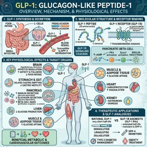 GLP-1 is secreted by L-cells in the small intestine and colon in response to food — particularly protein and fat. Its effects are rapid, potent, and multiple: